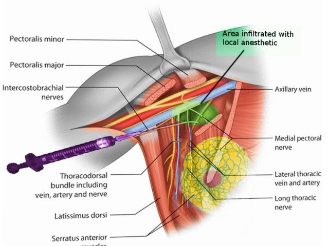 Mastektomie: Anheben des M. pectoralis major: Injektion zwischen major und minor (PECS I) sowie in die Faszie des M. serratus anterior (PECS II). Zusätzlich parasternale Injektionen sowie Subcutis im Narbenbereich.