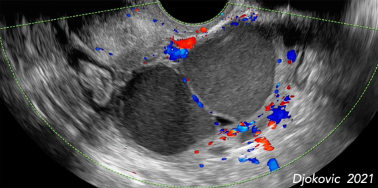 - TVUS: Uterus retro? Zeichen einer Adenomyosis (ungleiche Dicke von Hinter- u. Vorderwand, inhomogene Bereiche, Lakunen, hyperechogene Spots, inhomogene Perfusion, Endo-Myometrane Junktionszone, Question-mark Sign, Rain in the Forrest Phänomen)? Uterus auf eine Seite verschoben? Ev. Septum recto-vaginale mitbeurteilen. Douglas frei? Harnblasenwand, Hinweis auf RF? Ovarien: Endometriome?, ev. AFC je nach Fragestellung Kinderwunsch, Mobilität des Situs beurteilen.