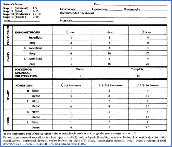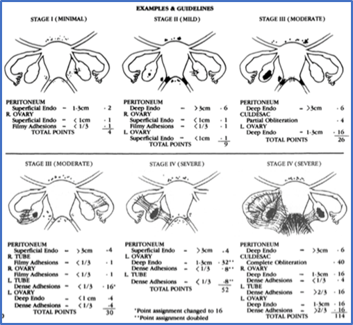 - CAVE: Ist das am Häufigsten verwendete Klassifikationssystem, es korreliert jedoch sehr schlecht mit den Symptomen, beschreibt die Tief-infiltrierende Endometriose nicht ausreichend und sagt nichts aus über den Schwierigkeitsgrad der Operation.