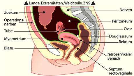 Am häufigsten lokalisiert sich eine Endometriose im kleinen Becken der Frau (pelvine Endometriose), jedoch können Endometrioseherde nahezu an jeder Stelle im Körper auftreten.