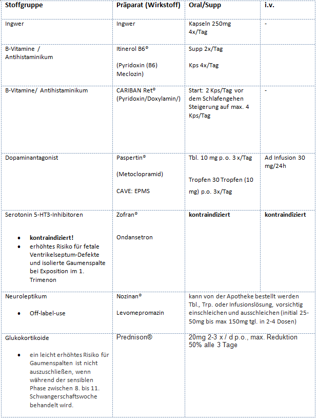 Bereits präkonzeptionell Multivitaminpräparat. Bei ersten Symptomen erfolgt die Umstellung auf ein Folsäure-Monopräparat, Vermeidung von eisenhaltigen Präparaten.