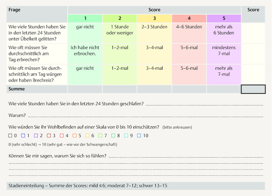 Zur Objektivierung des Schweregrades der Hyperemesis gravidarum wird in internationalen Leitlinien die Verwendung von Scores, wie z.B. dem PUQE-Score (Pregnancy-Unique Quantification of Emesis and Nausea) empfohlen, entwickelt durch das Motherisk-Programm in Canada.