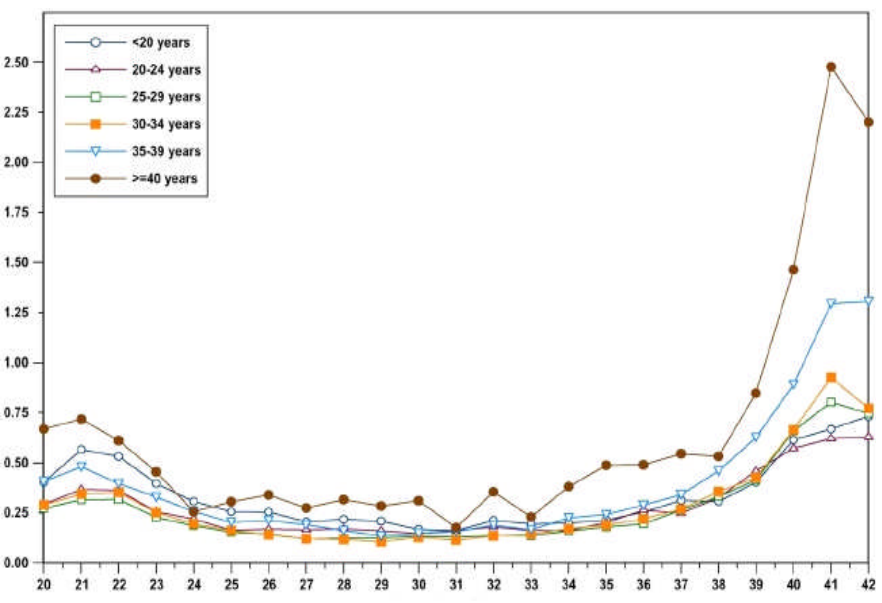Reddy 2006. Risiko für IUFT abhängig von Gestationsalter und mütterlichem Alter
