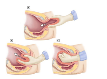 - Mechanische Maßnahmen: Massage des Uterus (endogene Prostaglandinbildung), bimanuelle Uteruskompression (z.B. Hamilton Manöver Abbildung 1 )