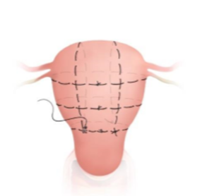 Kompression des gesamten Uterus inkl. des unteren Uterinsegmentes; Reduktion der uterinen Blutversorgung durch Ligatur der zuführenden Gefäße (Aa. uterinae und Rami uterini der Aa. ovaricae). Longitudinale „Rucksacknaht“ mit Inzision im unteren Uterinsegment.