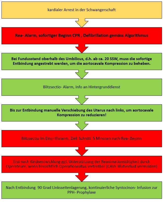 - Für eine erfolgreiche Reanimation muss der Uterus leer sein, d.h. dies hat oberste Priorität