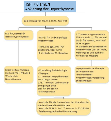 - Kontrolle TRAK im 1.Trimenon und in der 22.–26. SSW bei neudiagnostiziertem M. Basedow, jedoch auch bei St. n. Radiojodtherapie, St.n. Schilddrüsenoperation, anamnestisch Kind mit neonataler Hyperthyreose