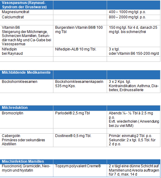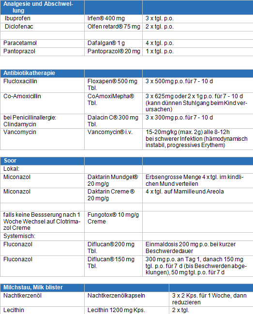 Im Stillambulatorium kommen neben physikalischen Massnahmen folgende Medikamente bei verschiedenen Indikationen zur Anwendung: