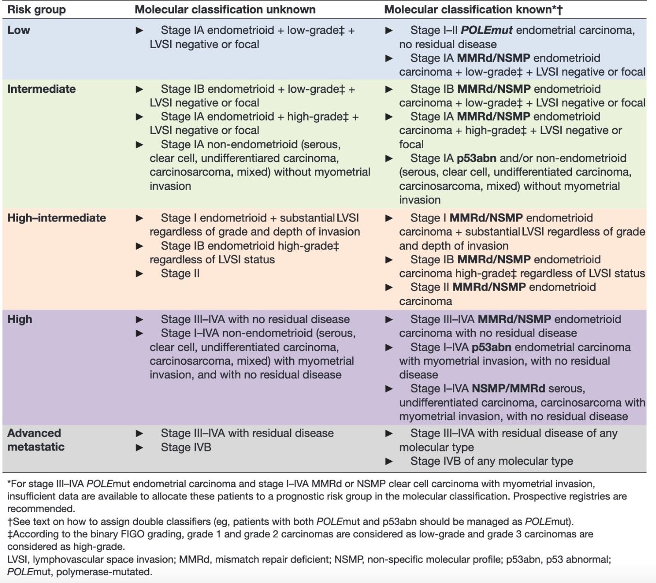 3. Concin N, Matias-Guiu X, Vergote I et al. ESGO/ESTRO/ESP guidelines for the management of patients with endometrial carcinoma. Int J Gynecol Cancer 2021;31:12-39. doi: 10.1136/ijgc-2020-002230