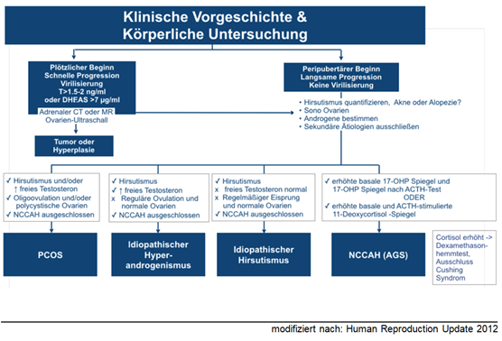 - Initial über 1.5-2.0 ng/ml oder DHEAS über 7 μg/ml bzw. rasch progrediente Androgenisierung Bildgebung zum Ausschluss androgenproduzierender Tumor des Ovars oder der NNR