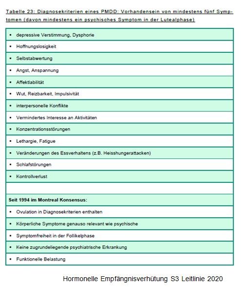 Der Einsatz kombinierter oraler Kontrazeptiva im Langzyklus zur Therapie des PMS sowie der Einsatz kombinierter Drospirenon-haltiger Kontrazeptiva zur Therapie von PMDD kann unter individueller Risikoabwägung (Thrombose) erwogen werden.