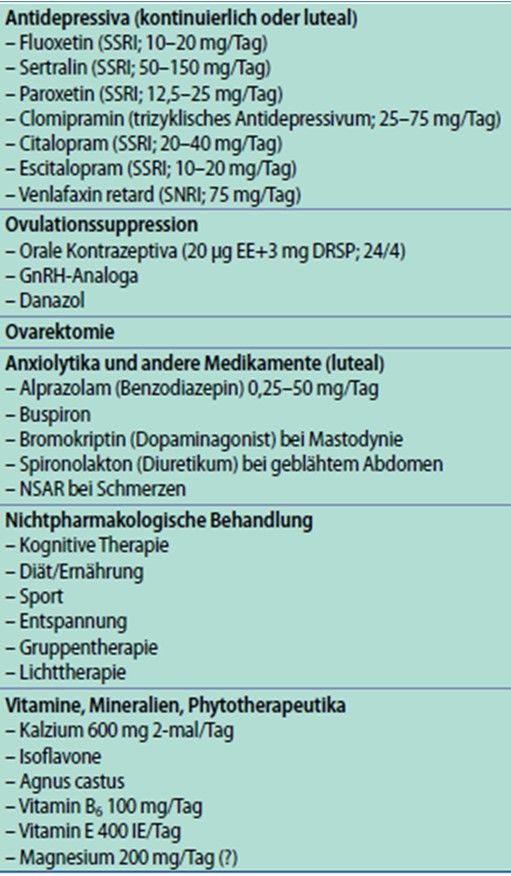 - Drospirenon-haltiges orales Kontrazeptivum: Bei PMDD können Drospirenon-haltige kombinierte orale Kontrazeptiva zu einer Reduktion der Beschwerden führen. Allerdings wurde auch ein großer Plazebo-Effekt nachgewiesen. Es ist derzeit unklar, ob der Effekt auch nach drei Monaten Therapiedauer erhalten bleibt.